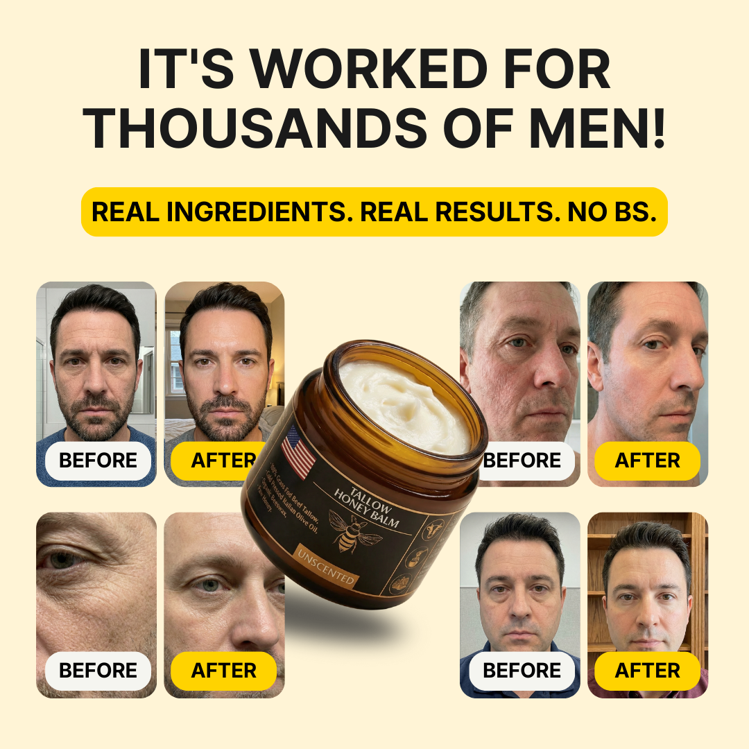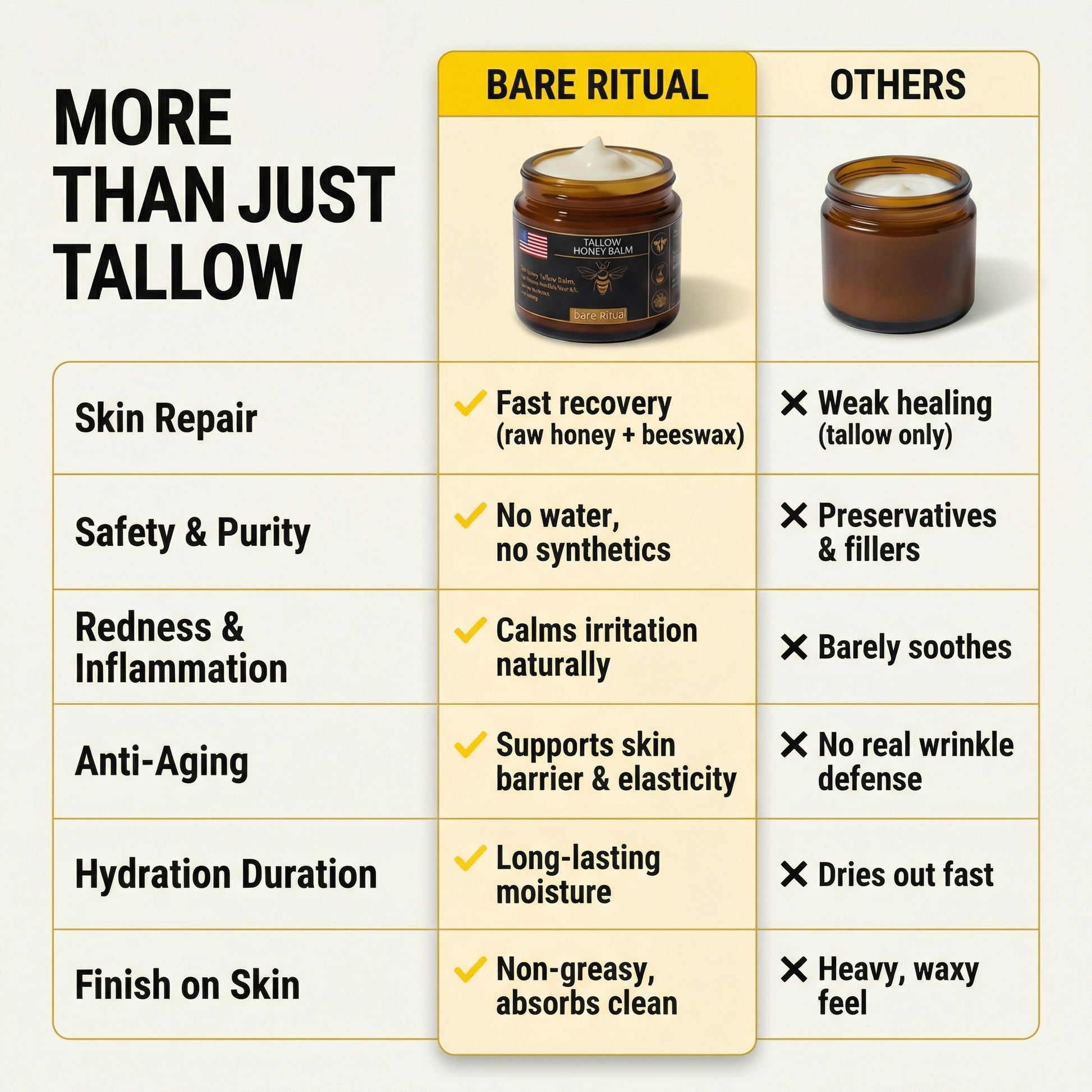 Our Tallow Balm contains only 4 natural ingredients: grass-fed, grass-finished beef tallow, cold-pressed organic olive oil, organic manuka honey, and organic beeswax. No fillers, no chemicals — just raw, unadulterated skin nutrition that helps your skin thrive naturally.